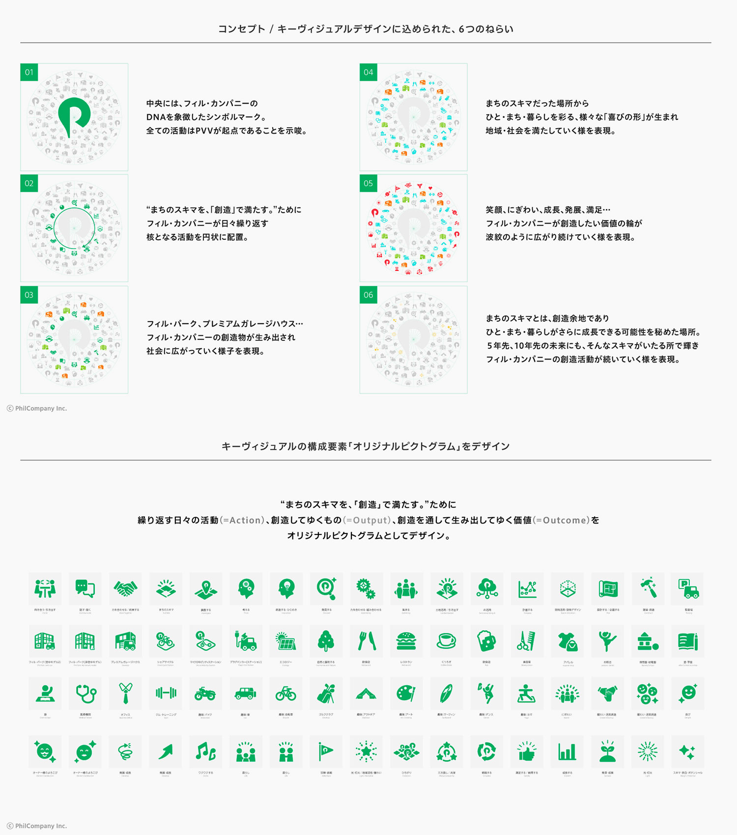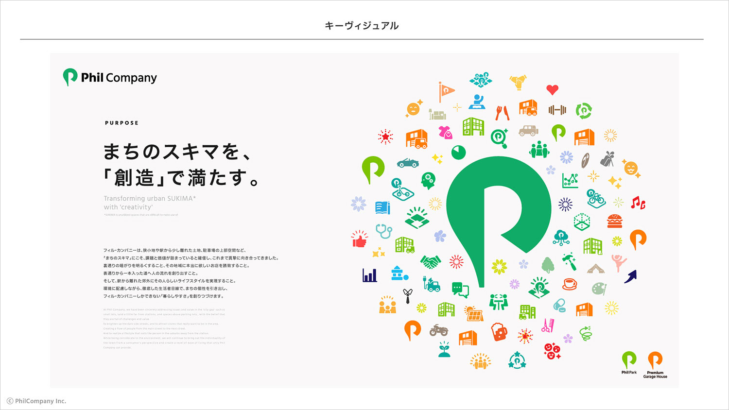▲CIの核となるフィル・カンパニーのキービジュアル。ロゴは、創業の理念であるPhil(=共存・共栄)、さらには、Phil Company / Phil Park / Premium Garage Houseの頭文字である「P」をモチーフとしたデザイン