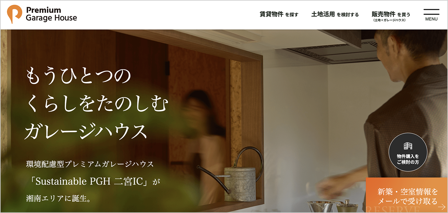 1階に広々としたガレージ、2階に居住空間を持つ車好きや趣味人向けの賃貸住宅「プレミアムガレージハウス」の「プレミアムライン」のコンセプト商品発表に伴うLPデザインもご一緒しました。
